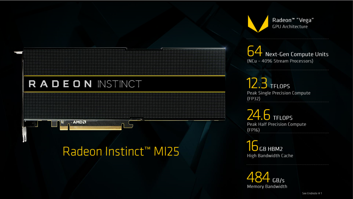 With the Radeon Instinct MI25 AMD’s now offering 24.6 TFlops of half precision compute, 12.3 TFlops of single precision, and 768 GFlops of double precision compute to its customers. This is all in a 300 Watt passively cooled dual slot form factor with 16 GBs of HBM2 memory clocked at 945 Mhz on a 2048-bit memory interface for a total of 484 GB/s of memory bandwidth.